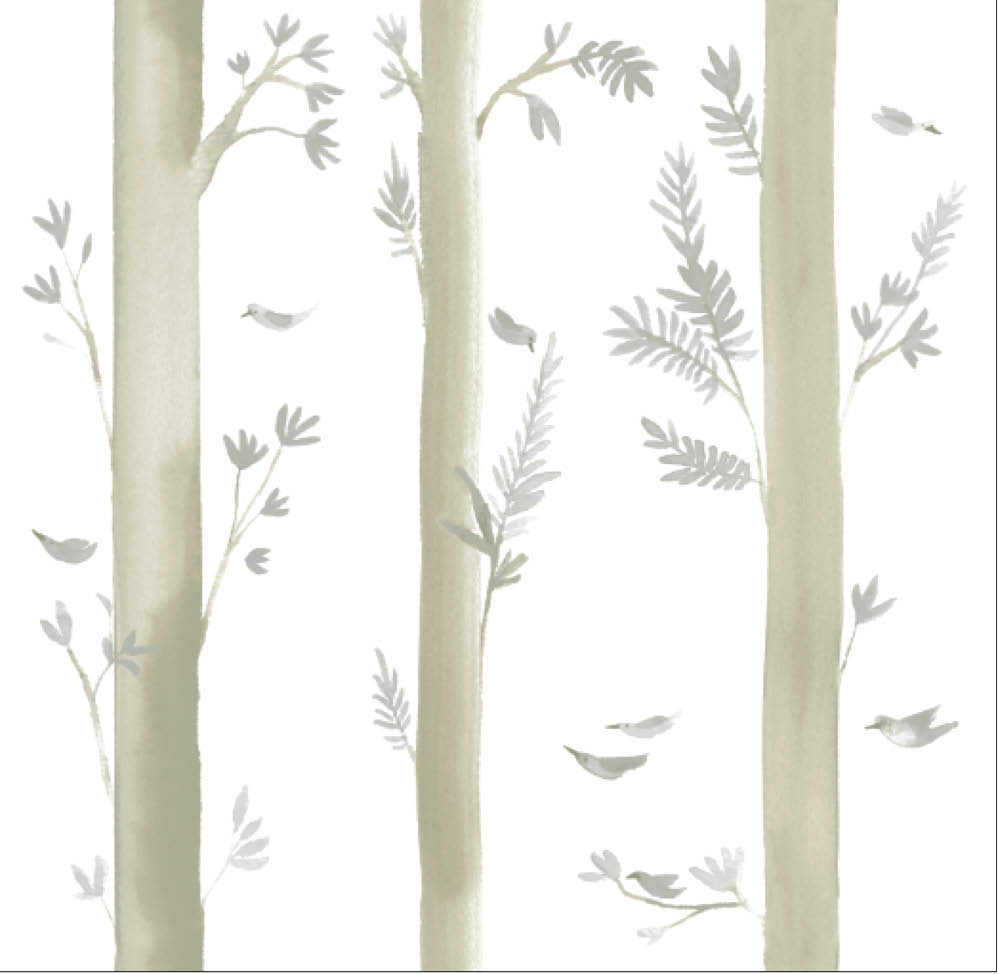Este modelo de papel pintado con estilizados troncos de árbol nos dará un efecto de rayas verticales en la pared que elijamos. Aquí las rayas de acuarela nos esconden troncos, ramas y pájaros en tonos verdes y beiges. Su ligereza en forma y colorido lo hacen ideal para cualquier estancia y para combinarlo con otros modelos.