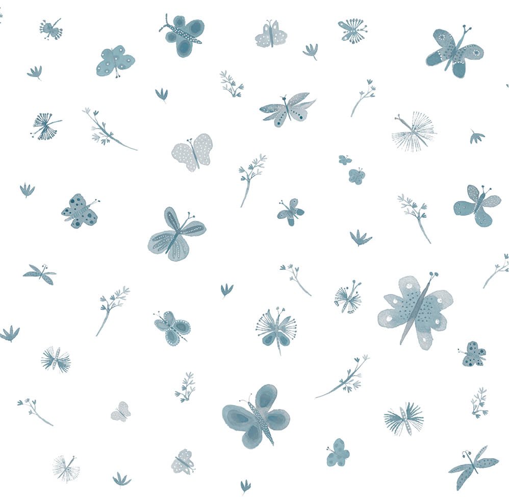 Papel pintado infantil con desenfadada interpretación de mariposas, libélulas y ramitas en tonos multicolor sobre fondo blanco. Ideal para acompañar cualquiera de las estancias de los pequeños de la casa. Atrévete a combinarlo con nuestra rayas 3D -Pint, ¡Verás qué bonito queda!