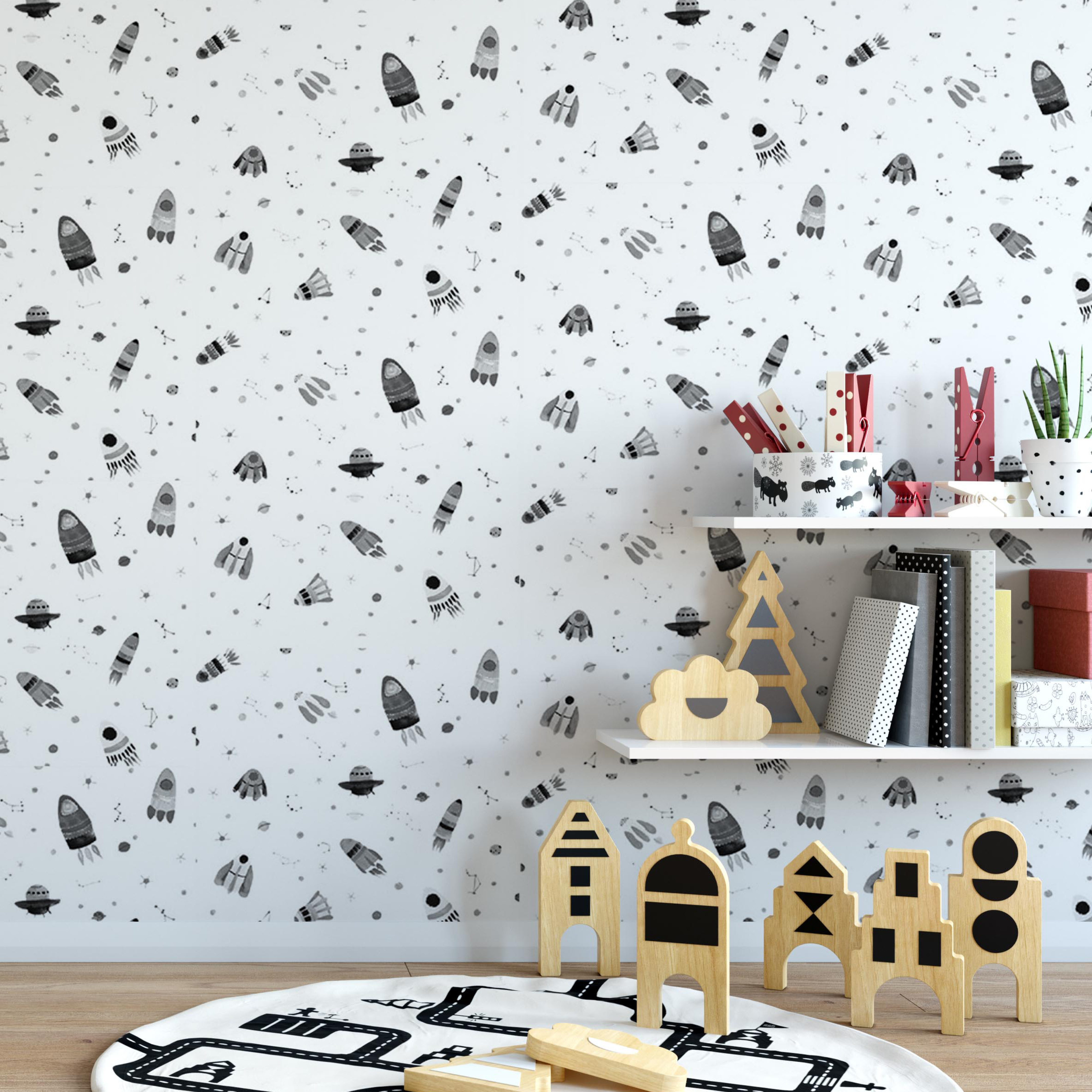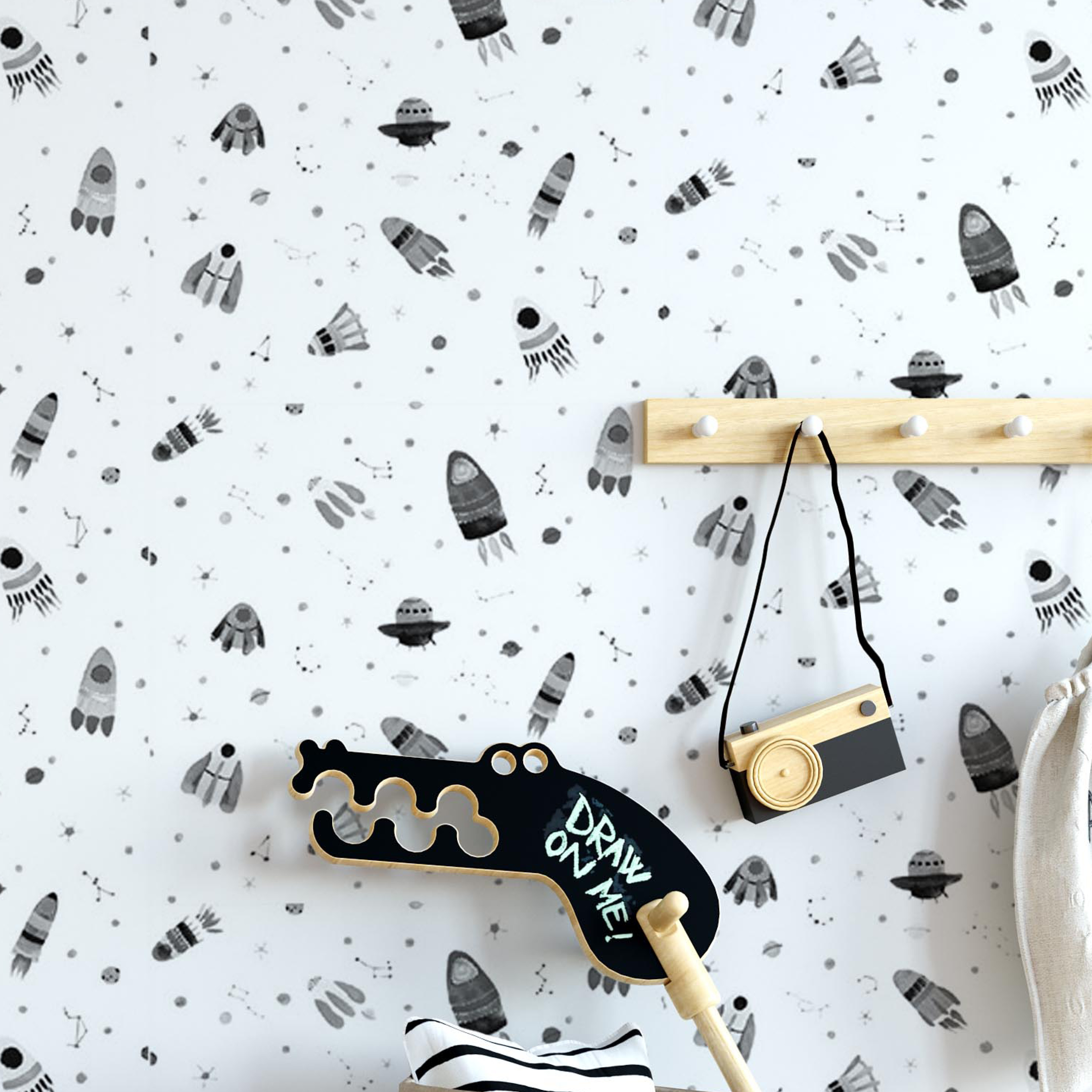 ¡Os presentamos nuestra versión del Space Oddity en papel pintado!  Este galáctico diseño de naves y cohetes multicolor viajando en una  galaxia de acuarela sobre fondo blanco nos disparará hasta el espacio exterior. Atrévete a combinarlo con nuestro modelo “Cosmos” repleto de constelaciones.Lo encontrarás disponible en 3 colores diferentes: multicolor con fondo blanco, multicolor con fondo azul noche y en escala de grises.