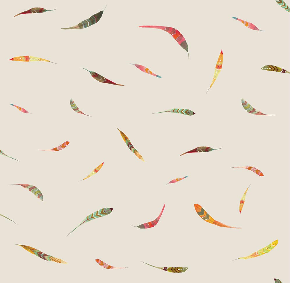 Vuelo de ligeras plumas flotando en el aire, dibujadas con trazos de acuarela en varios colores sobre un fondo blanco. Ideal para aportar calma y frescura en cualquiera de tus estancias.
