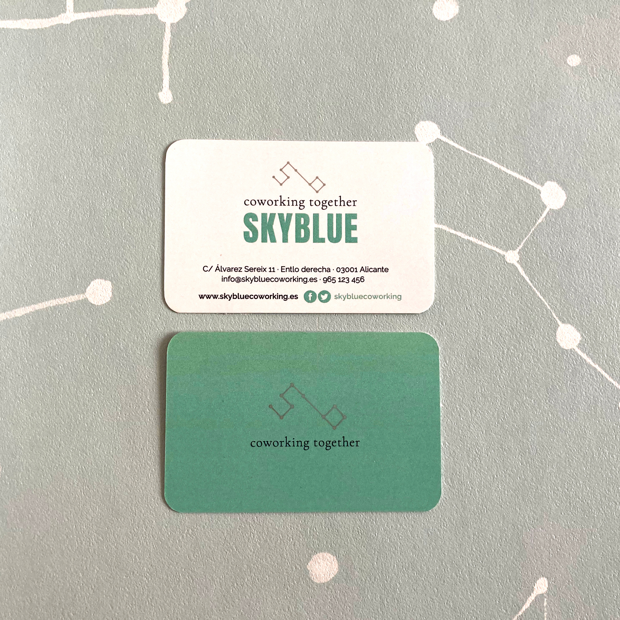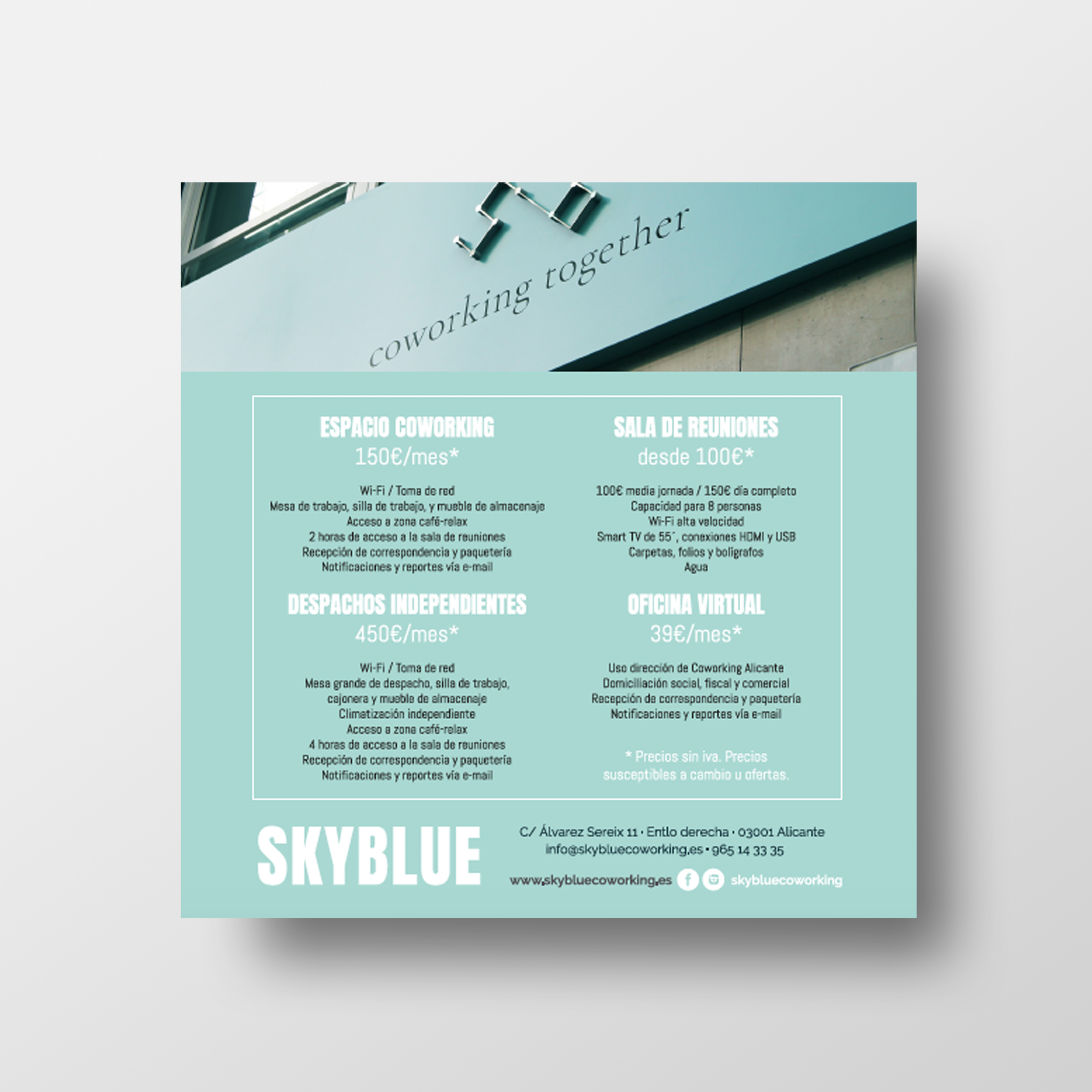 Diseño de marca, señalética e identidad corporativa de Espacio Coworking SKYBLUE. en la Calle Álvarez Sereix de Alicante Proyecto en colaboración con Francis Moreno Young.