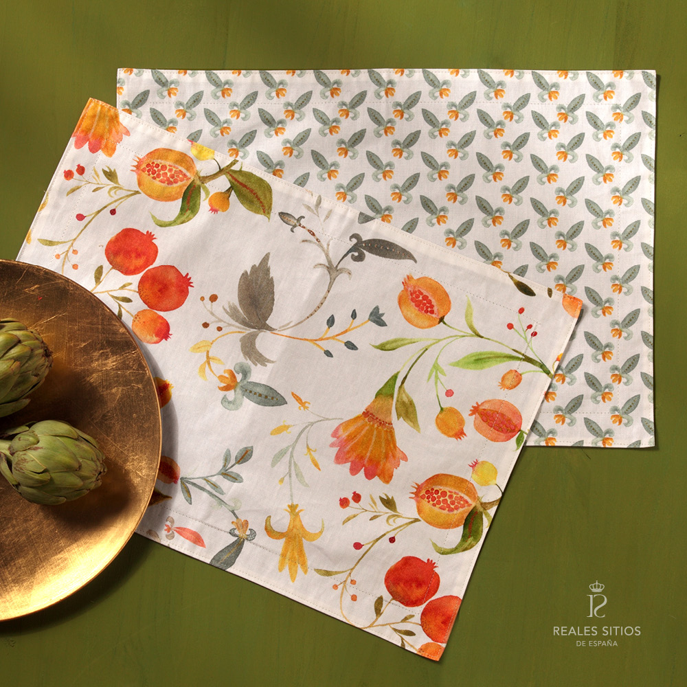 Partiendo de dos elementos clave en la simbología del escudo de armas de España; la granada y la flor de lis, se ha creado un estampado en arabesco que combina jugando hasta la invención con la fruta y la flor.