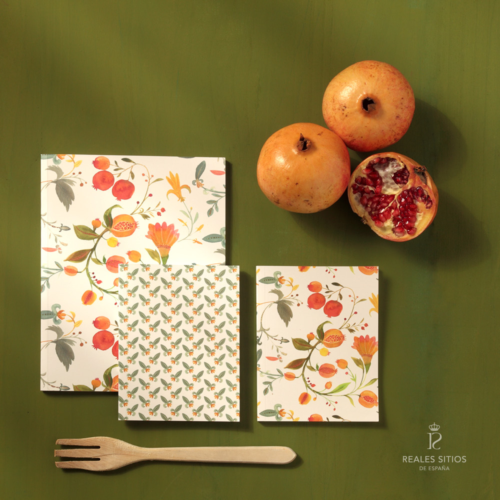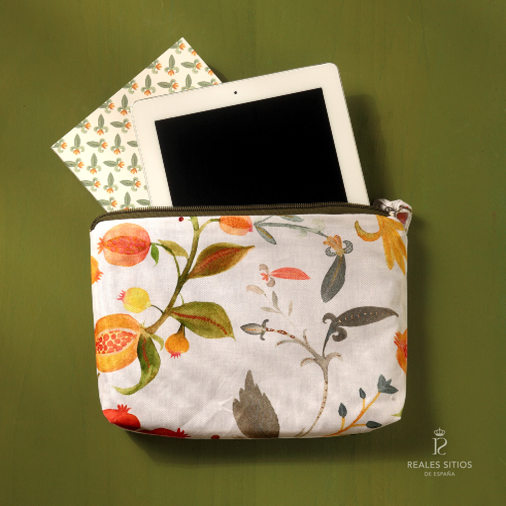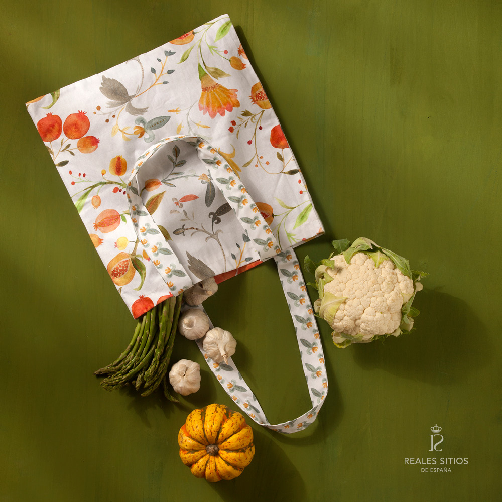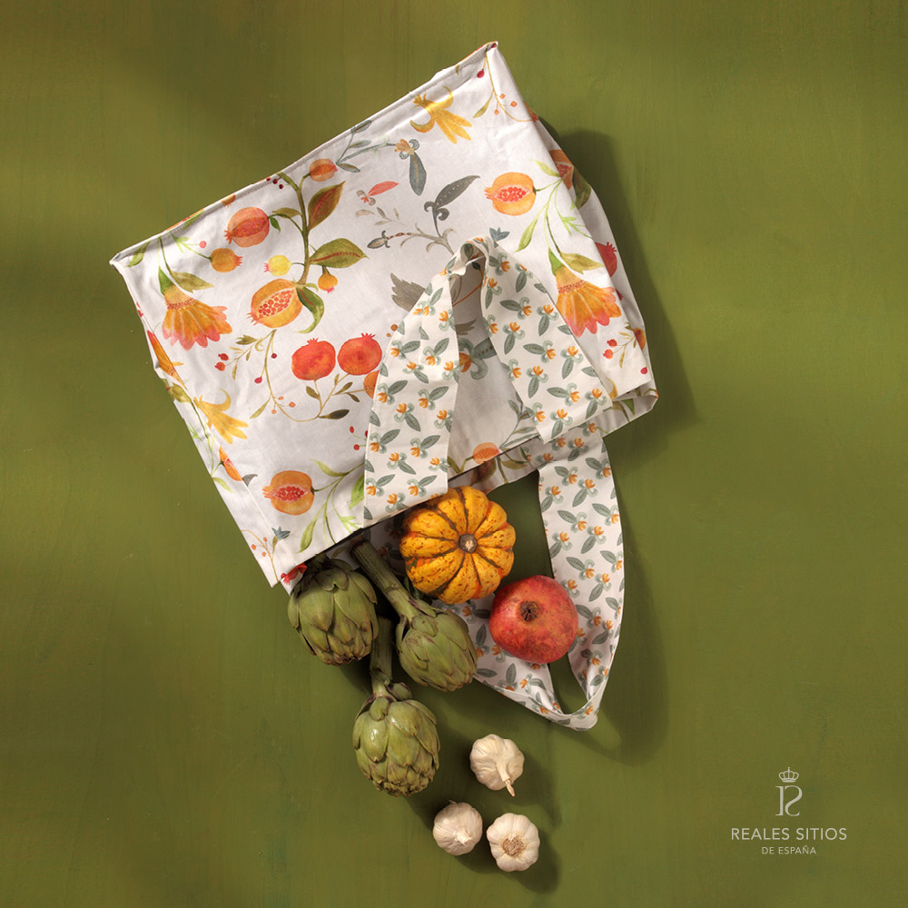 Bolsas tote, bolsas grandes, manteles individuales, fundas de ipad y cuadernos diseñadas en exclusiva para tiendas de Palacio Real de Madrid, Palacio Real de Aranjuez, Real Granja de San Ildefonso y Real Alcázar de Sevilla.